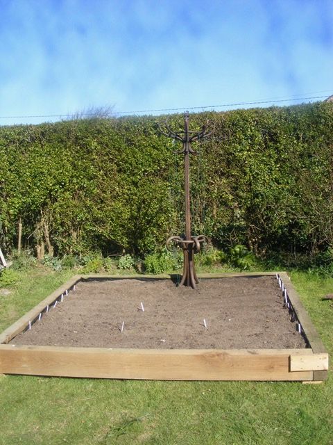 We lined it with some weed suppressant, stapled it all to the sides and filled it with available soil and old potting compost as we couldn’t get any from elsewhere. I didn’t have any bean sticks but had an old coat stand destined for the tip some while ago, but it never made the journey. So hey presto something to grow my beans and peas up.