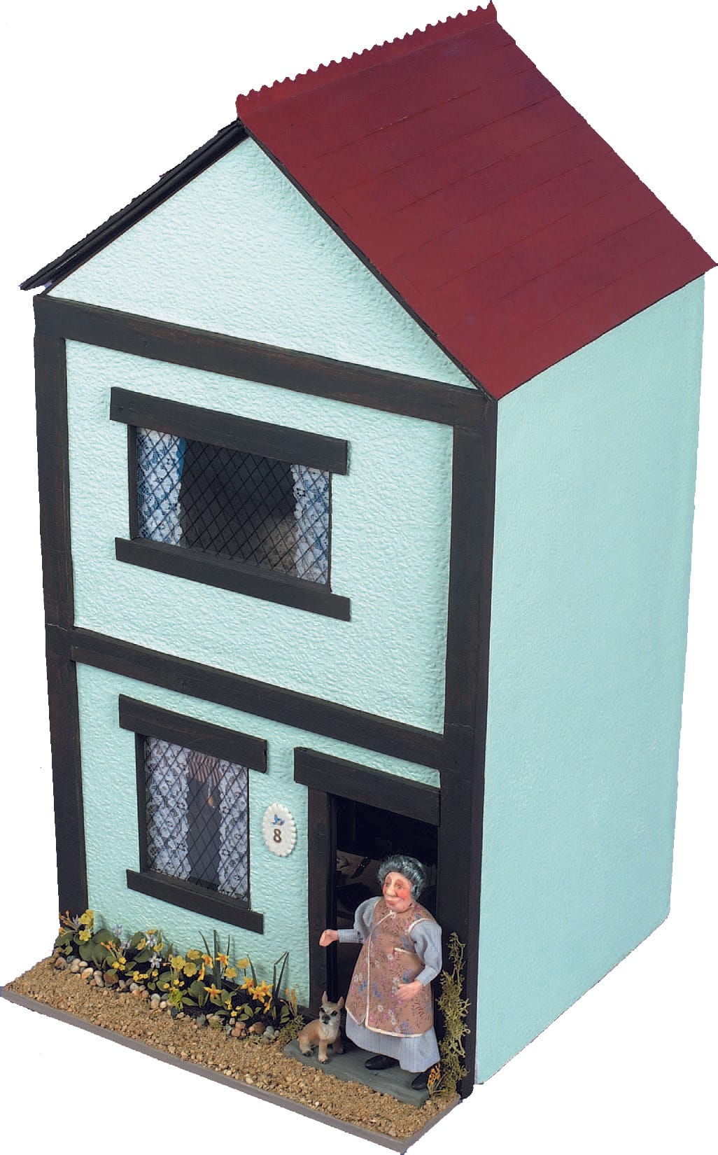 The plaque is made from Fimo, using a cake decorating cutter, a stick-on number and a transfer. The path is sand mixed with PVA glue and the step a piece of Balsa wood, painted grey, with the centre worn down a bit with sandpaper. The dog is a miniature’s fair purchase and the flowers are made from bread dough, as detailed in a previous issue of DHW.