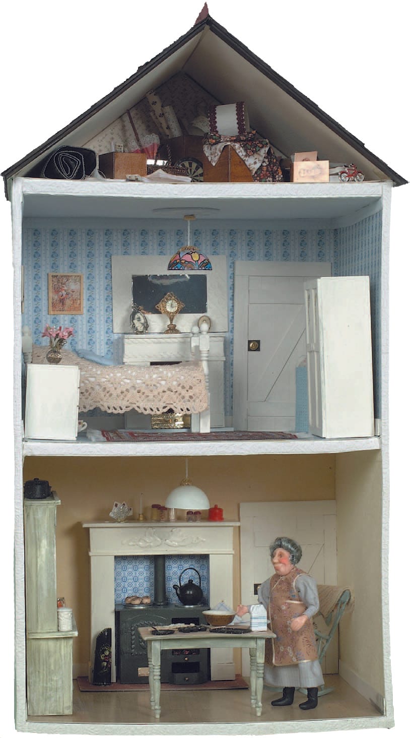 The whole procedure could be simplified by gluing together two small cardboard boxes, or more, and letting children use their imagination. The furniture could be bought. Cardboard boxes are free from the supermarkets; wallpaper samples for walls and floors are also free from DIY stores. Most of us have emulsion paint left over from full scale decorating, or sample pots are cheap.