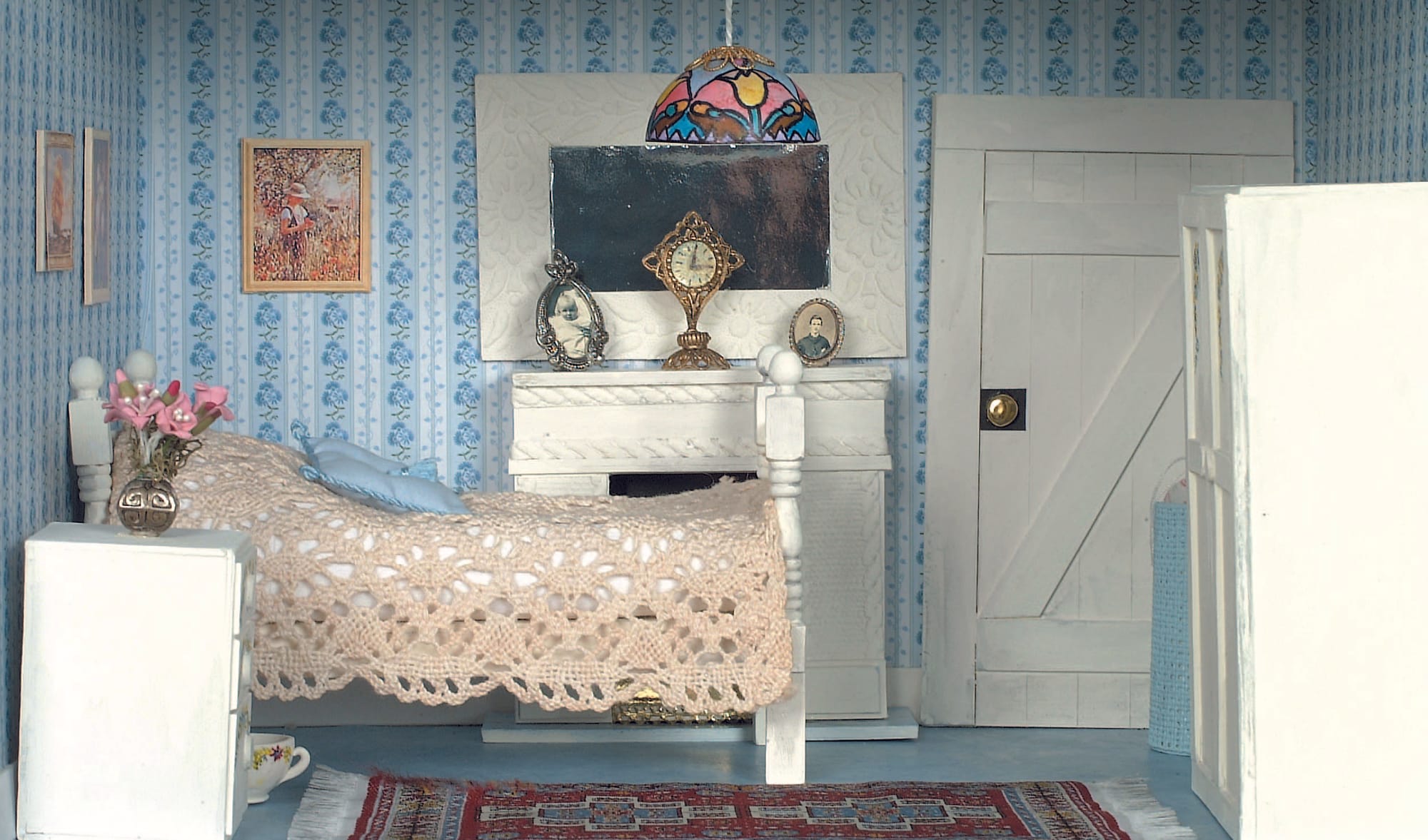 Decorate with flowers. Add bedclothes. The bedspread shown was made from strips of cotton lace machined together and hemmed along cut edges.