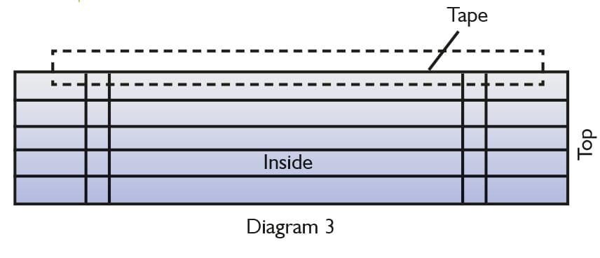 You should now have strips of card 14in wide with markings at 1in intervals along their length. Snip into these marking for 1in. Cover your roof cardboard with these tiles, overlapping each strip, starting from the bottom.