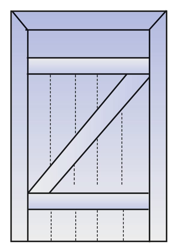 Add further ½ in strips to door as shown in diagram. Trim all edges level. Emulsion. When dry, add a tiny square of thin black card and centre the door knob on this. A bead or top of a paper clip can be used for the handle.