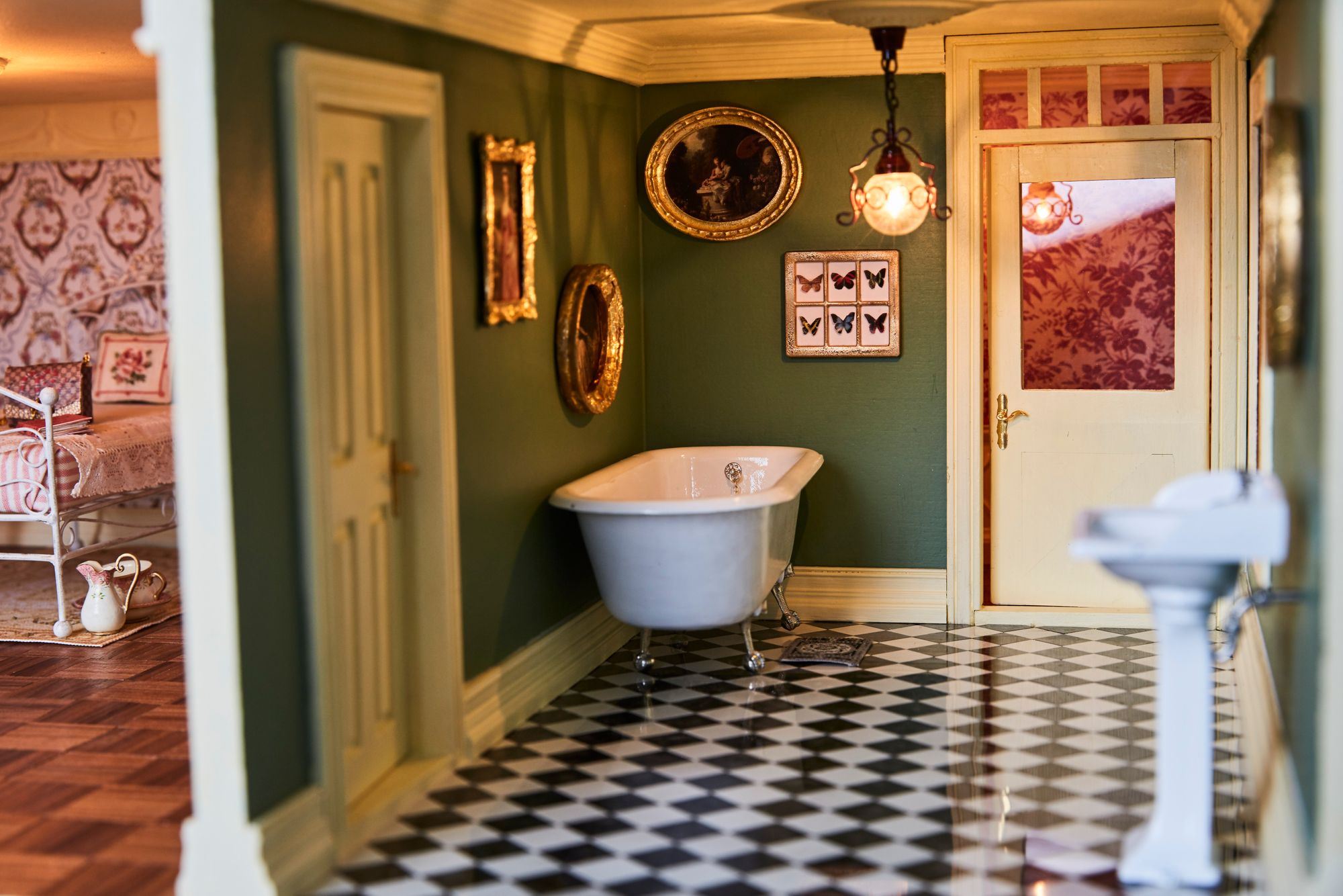He also made my favourite Golightly Miniatures pieces in the house — the gorgeous wrought iron bed and butterfly boxes. Shaun makes all of our butterfly products and everybody loves them. They are based on the butterfly boxes we have on display in our own home. I also adore the dressed mannequin my sixteen-year-old sister made. The chinoiserie screen displayed in the lounge was also one of the first decorated furniture pieces I made and it is very close to my heart.