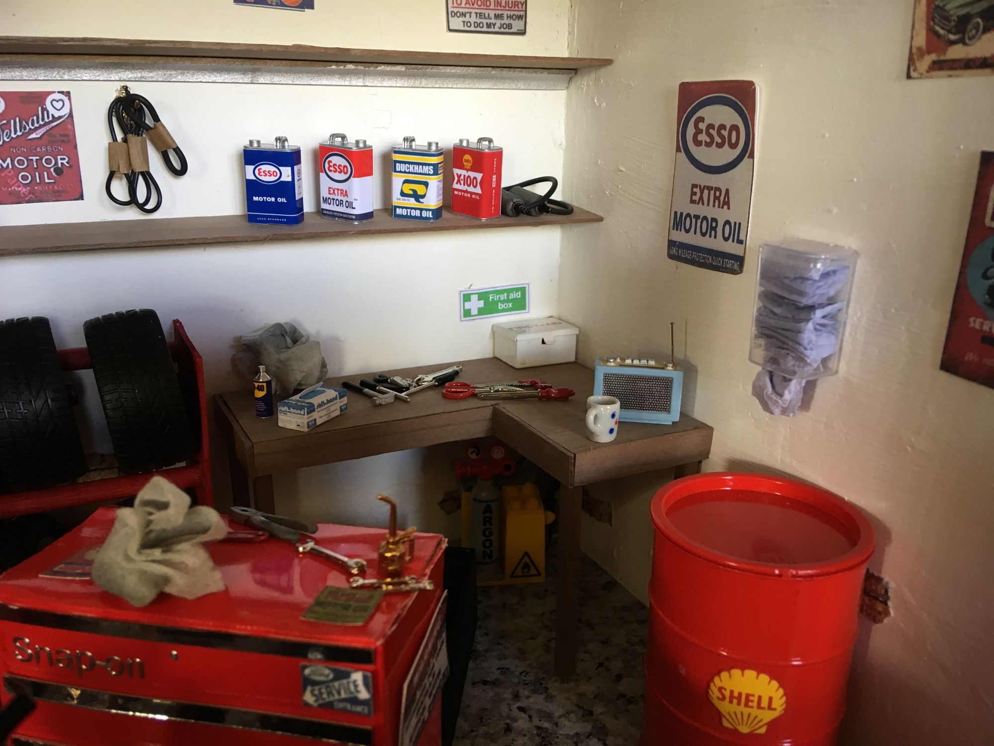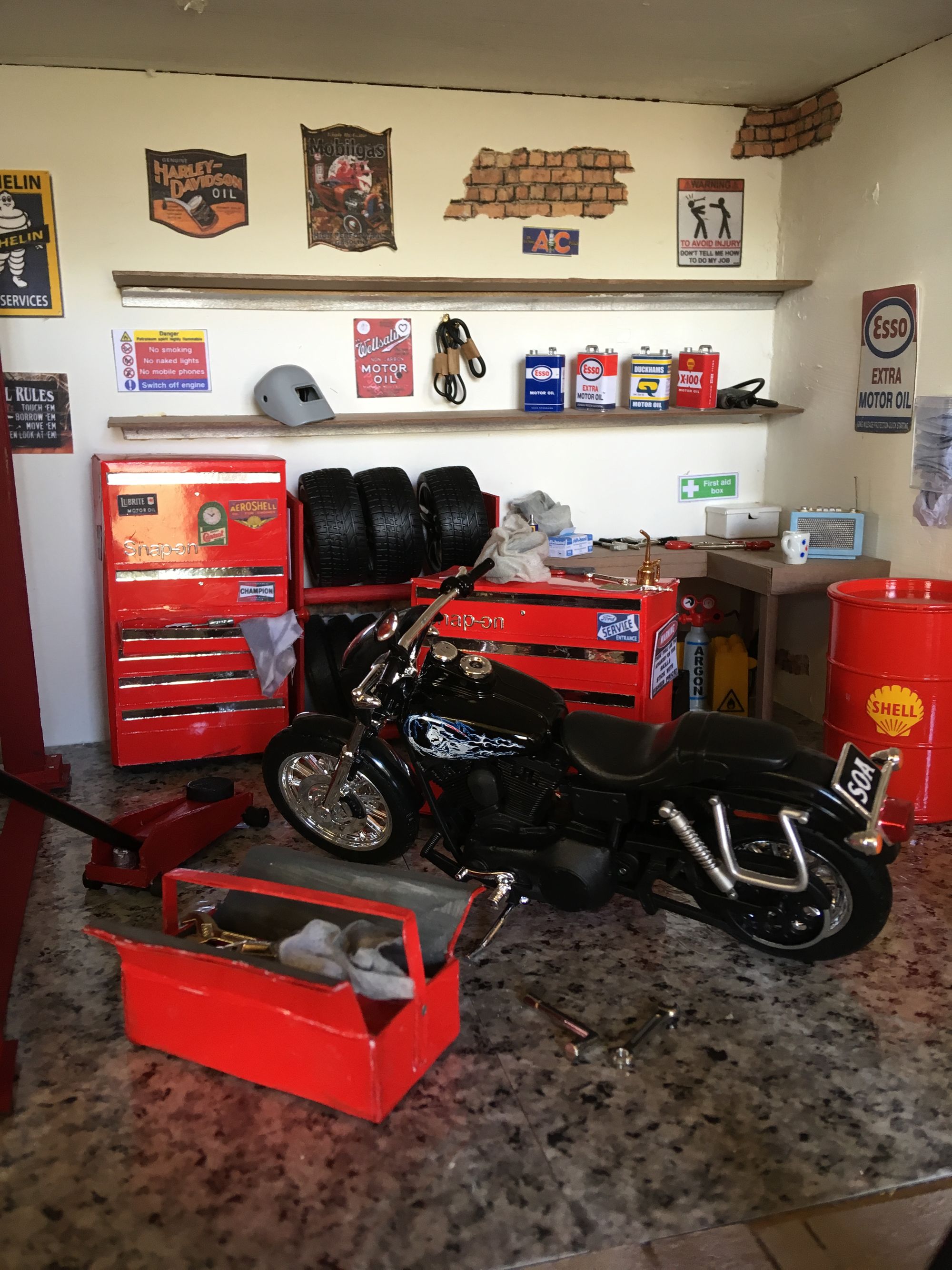 An old and battered car was rescued from stock and, although it is slightly smaller that one twelfth it looked just right. Barbara wanted to make as much as she could and started with the red tool chests as her son had a full size one, which made it easy to copy. They are simply card painted red, with a false drawer added to the front, so it appears to be open. Brilliant.