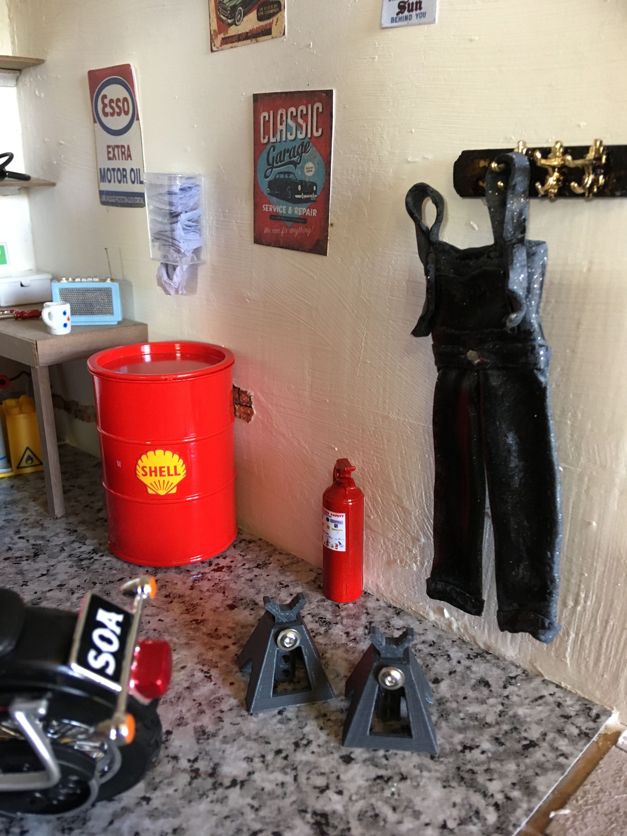 The fabulous pair of overalls hanging up was made by Lynette Smith, a very talented lady already known to regular readers. There is even a radio and first aid box with the mandatory dirty mug here. Again, just study the detail — amazing.